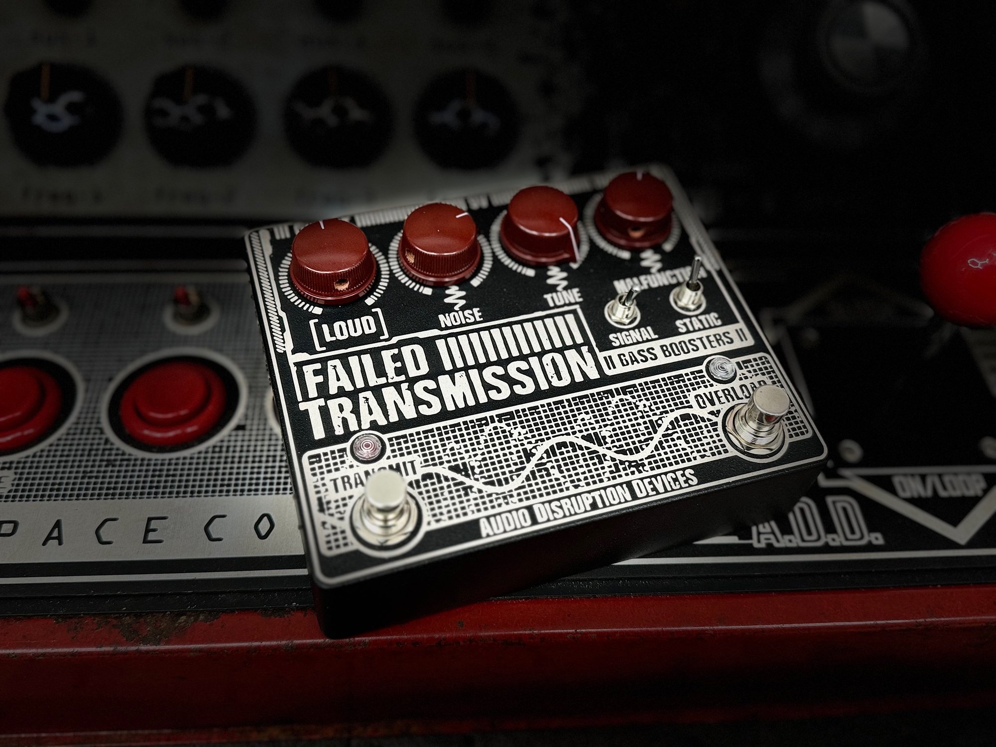 The Failed Transmission is a gnarly oscillating fuzz unit with an overload switch that can activate two gain levels an a blend that will let you dial in the amount of chaos. With these you can create anything from simply background artifacts to synth-y octave fuzz to all out robot noise. A frequency ("tune") knob sets the pitch of the oscillation, and the "Malfunction" knob can add envelop control to sweep the frequency and create auto wah-like effects. In addition, tone toggles can add additional bass to instrument ("signal") and oscillator ("static") signals.