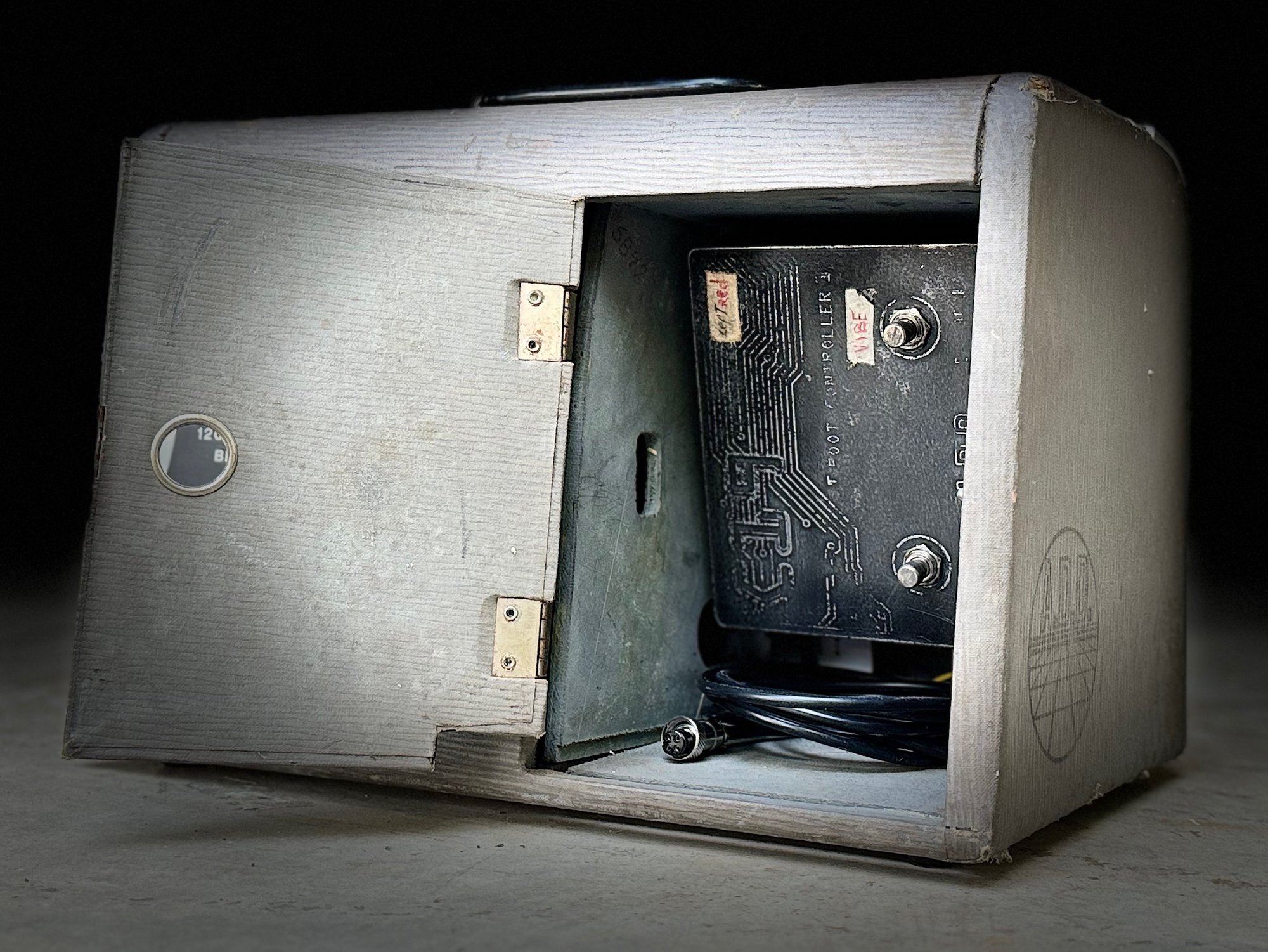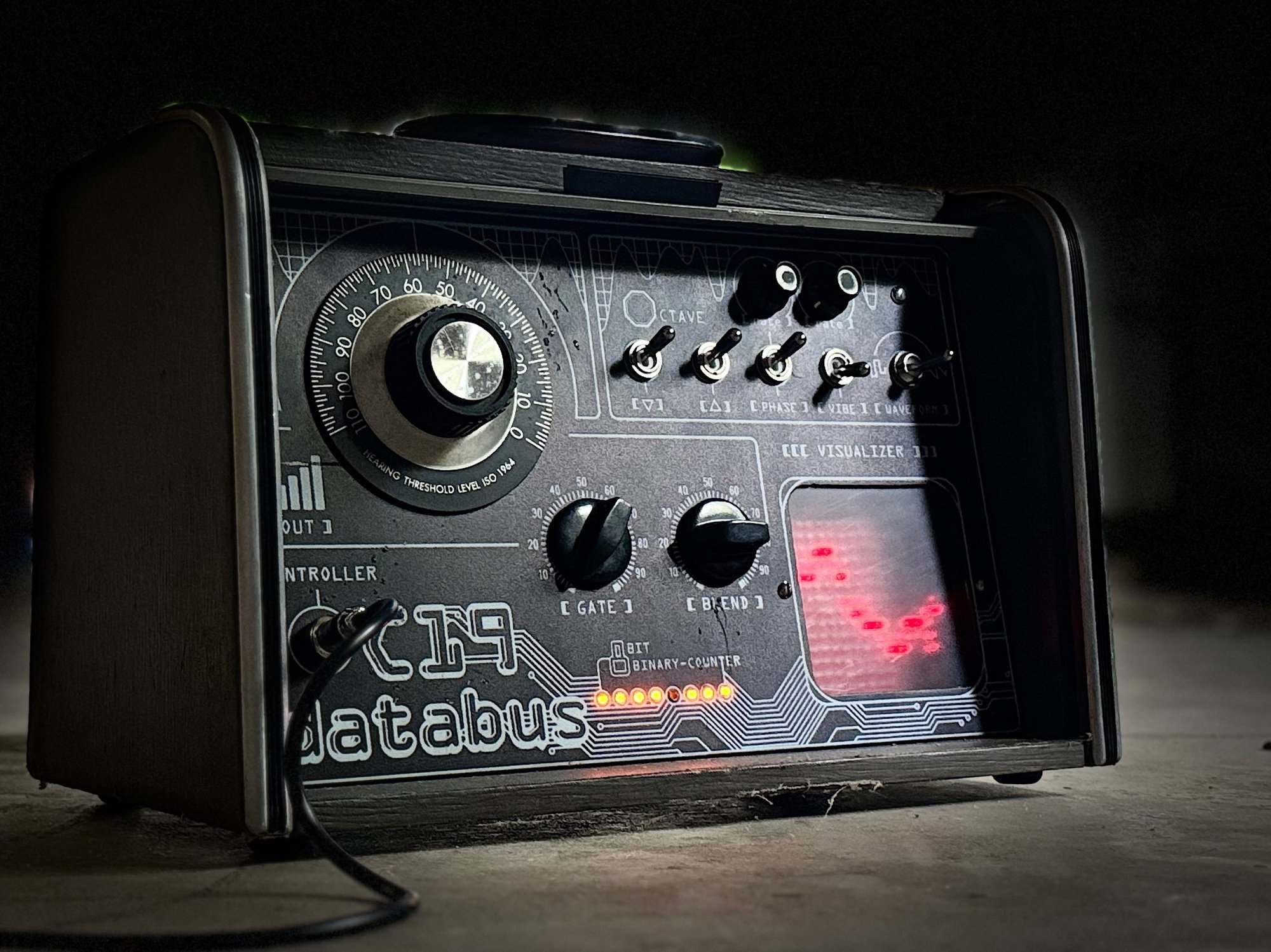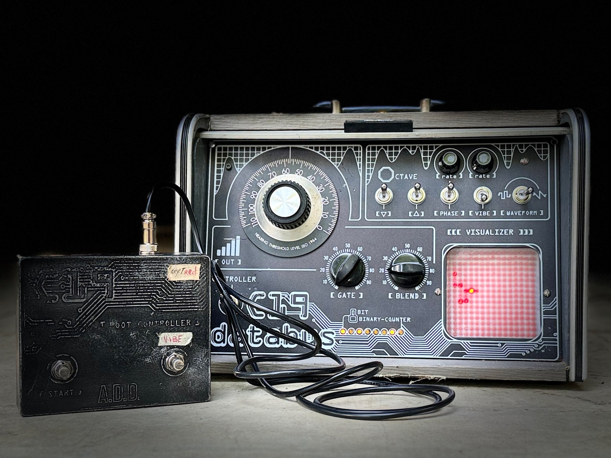 Built in a rare vintage audiometer (that looks kinda like an old breadbox - with a retractable front cover). This unit features a parasit studio C19 Databus Drive circuit - a CMOS guitar synthesizer with octave up, octave down features plus sawtooth and square wave modulation and vibrato and phaser modulation. Plus a functional led oscilloscope! It can even generate its own signal. You can find videos on my IG page.