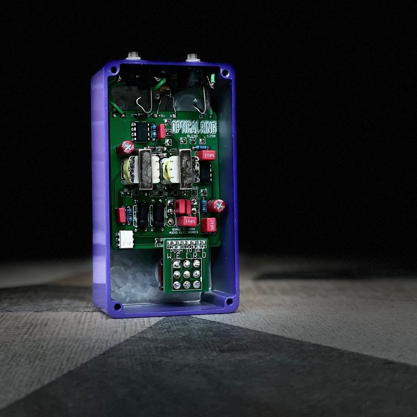 The optical ring is a unique and dynamic ring modulator. With a carrier frequency created by an internal optical theremin, and modulated by clipping LEDS, the sound can warp based on your attack. It has three controls: ring (a blend between fuzz and ring modulation), output (volume), and frequency (sets the pitch of the theremin oscillator). In addition, a gain toggle effects fuzz character and ring mod threshold, and a shift toggle opens up traditional robot-like ring modulation, glitchy fuzz, or stuttering tremolo sounds.