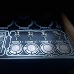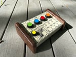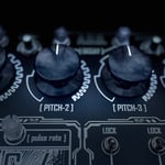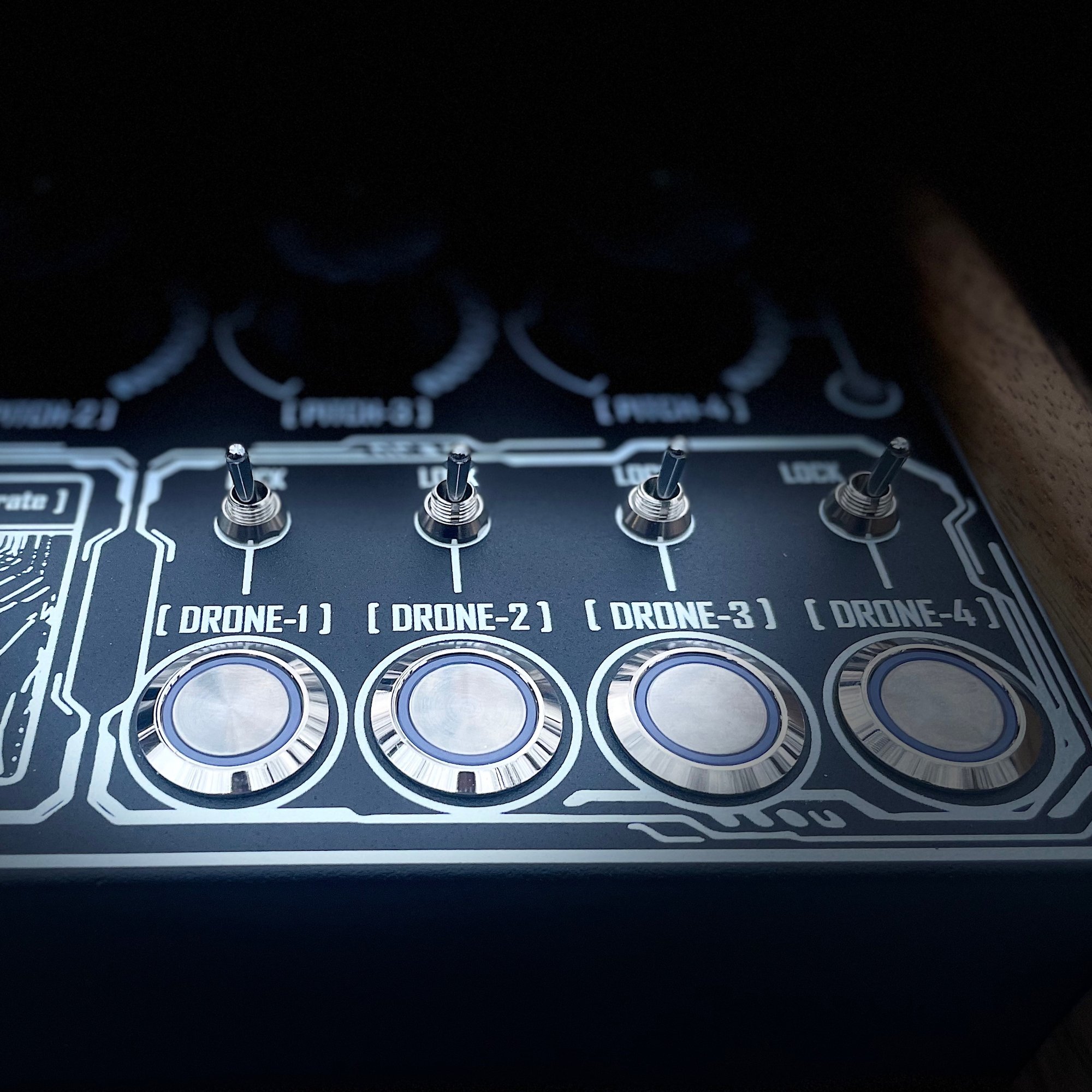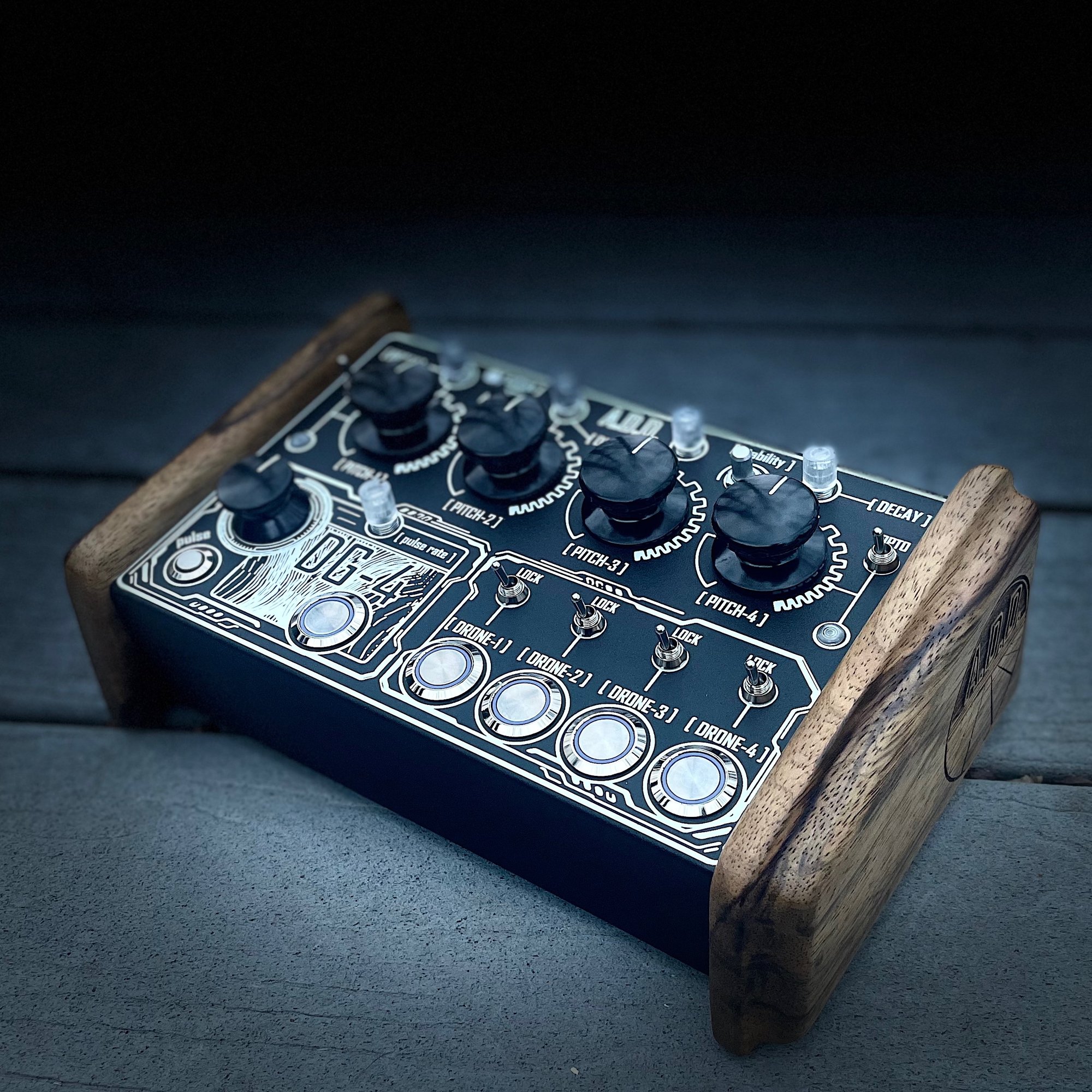 Drone generator unit. Textured black finish with white ink and optional wooden sides (example pics feature black limba sides with a German carve). The DG-4 features four independent drone lines with pitch and decay (sustain) controls. A global stability control can add grit and unpredictability, and a low pass filter can cut some do the highs to clean things up. This filter can also be pulsed to create a rhythm component. Drone lines can be activated with buttons or locked on (if locked the buttons act as mutes). Additionally, two optical sensors can be used to morph the pitch of drone lines 1 and 4. Buttons and decay controls have corresponding led lights that let the user know which controls to spin (and they create a neat led light show when playing).